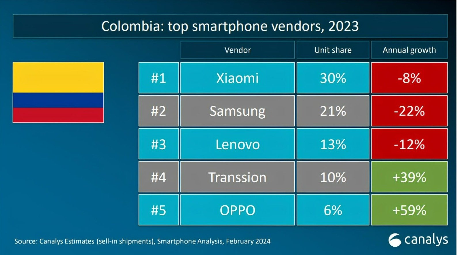 COLOMBIA (Febrero 12 de 2024). Por tercer año consecutivo, Xiaomi alcanzó el primer lugar en términos de despachos de teléfonos inteligentes en el país durante el 2023. De acuerdo con la firma de análisis del mercado, Canalys, la compañía tecnológica cuenta con una participación del mercado del 30 % en el país, mientras que en latinoamérica se posiciona en la tercera posición con una participación del 16% y un crecimiento anual del 11%.